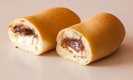 Pãozinho artesanal recheado com chocolate branco e chocolate ao leite.